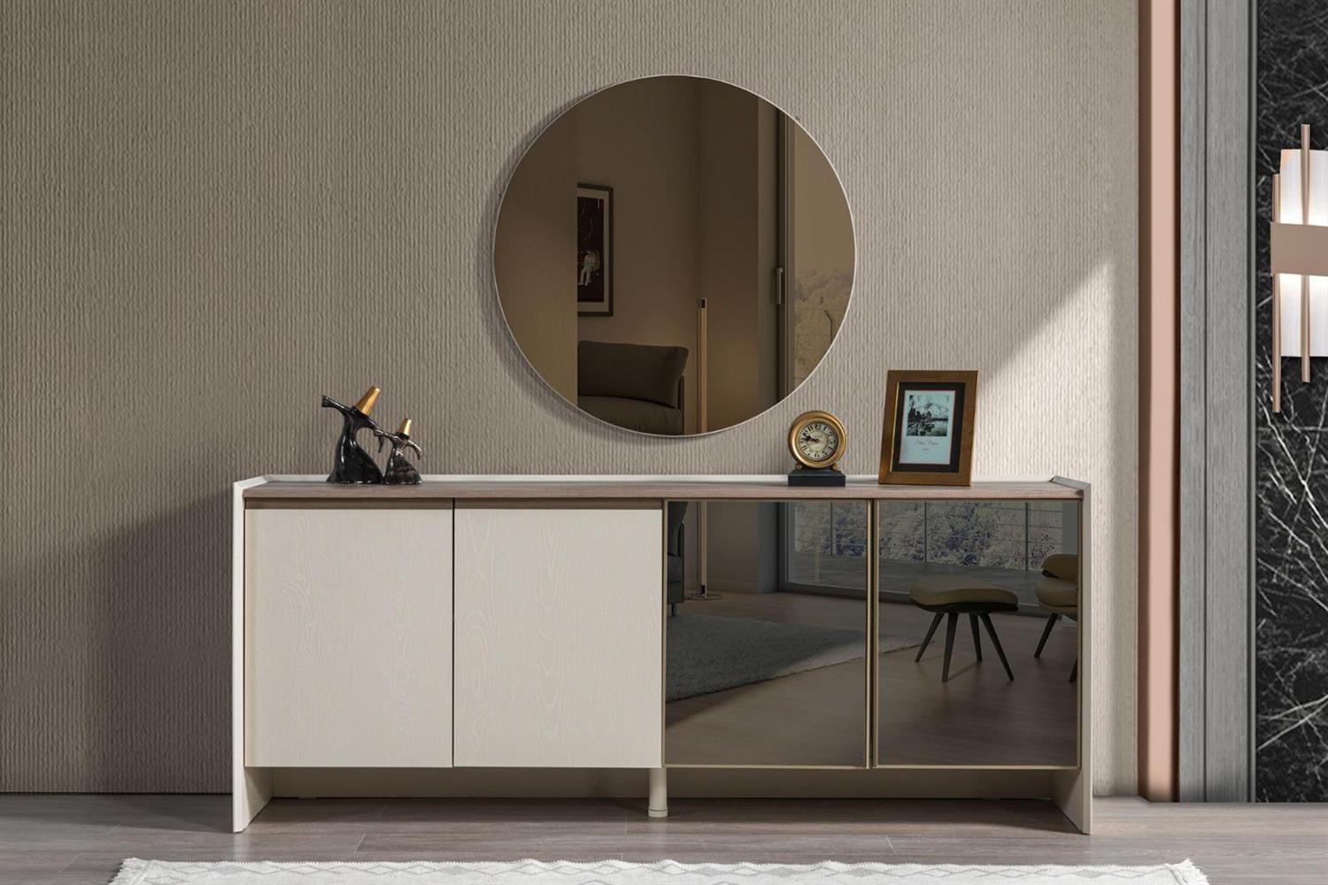 Ürün İçeriği 1 Adet Konsol ve Aynası, 1 Adet Yemek Masası ve 6 Adet Sandalye'den oluşmaktadır.