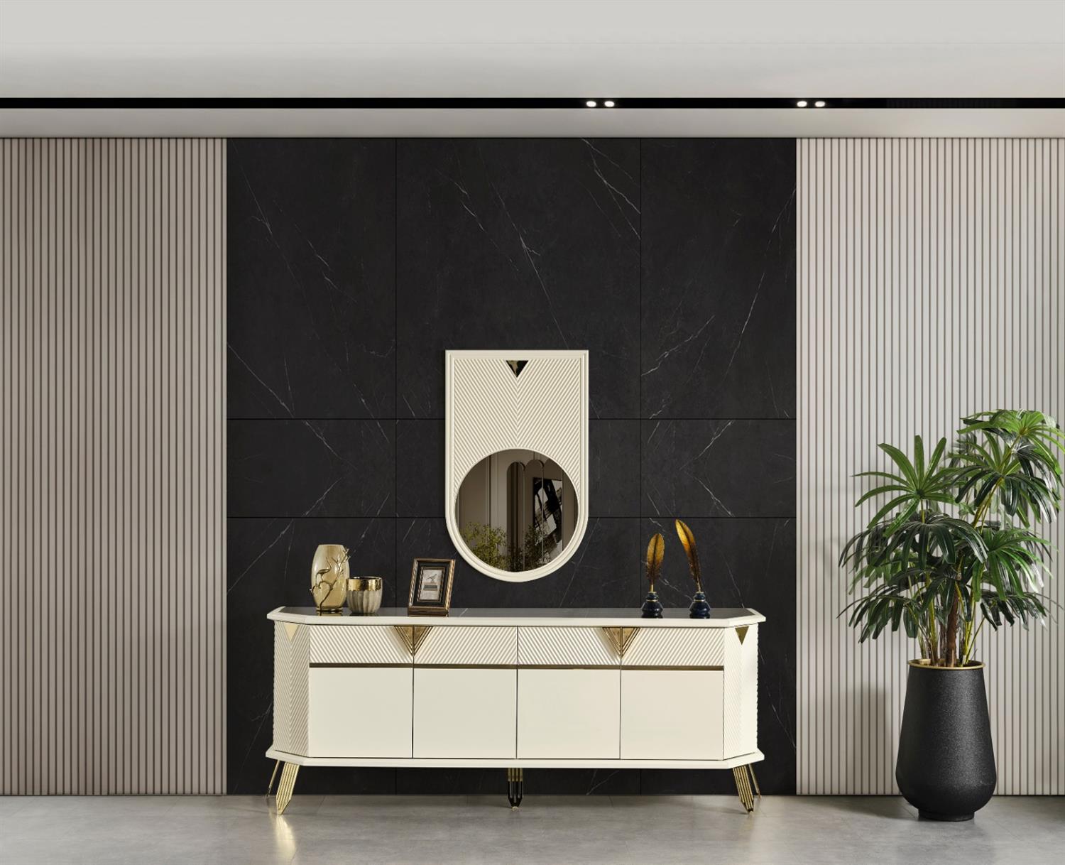 Konsol MDF malzeme üzeri lake boya ile üretilmiştir. CNC desenler ile dekore edilmiştir. Ayaklar metal malzemedir.