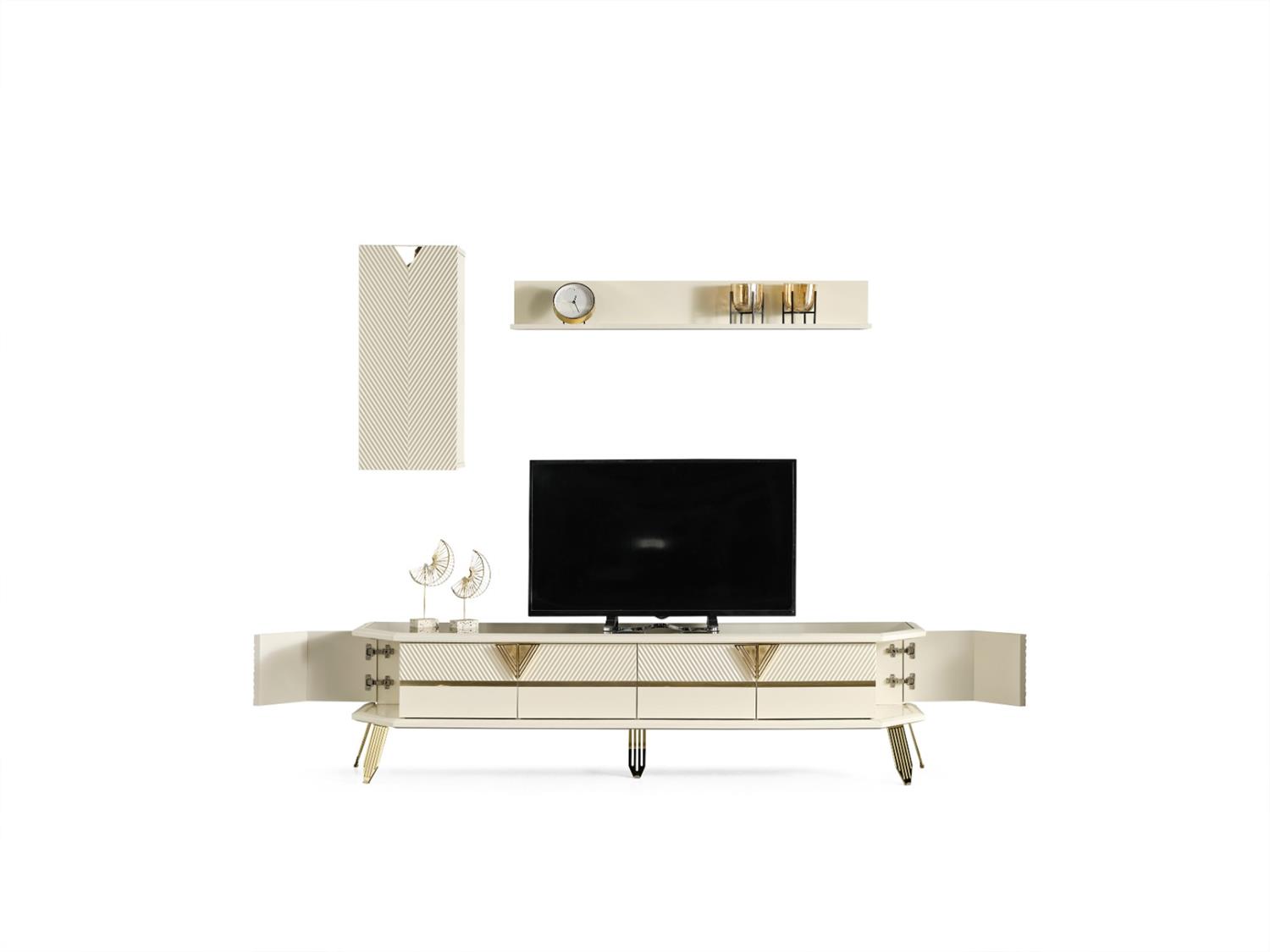 Tv Sehpası MDF malzeme üzeri lake boya ile üretilmiştir. CNC desenler ile dekore edilmiştir. Ayaklar metal malzemedir. Çekmecelerde yavaşlatıcı tandem ray kullanılmıştır.