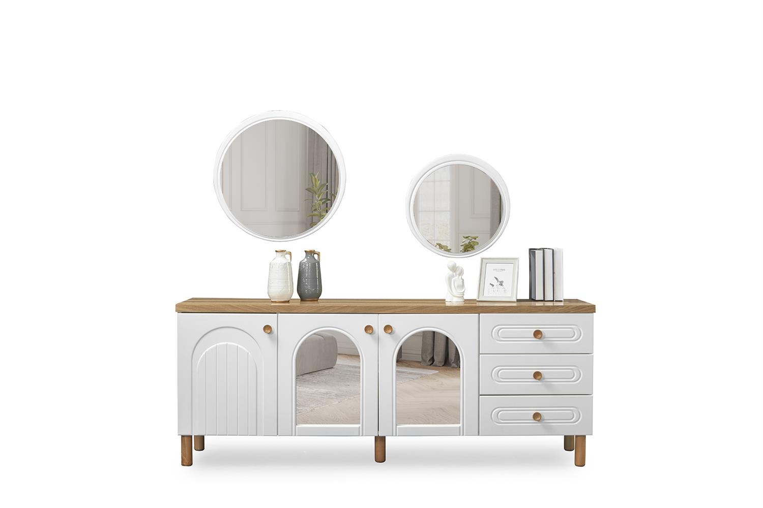 Ürün İçeriği 1 Adet Konsol ve Aynası, 1 Adet Yemek Masası ve 6 Adet Sandalye'den oluşmaktadır. Tv Sehpası, Tv Ünitesi opsiyonel olarak satışa sunulmuştur.