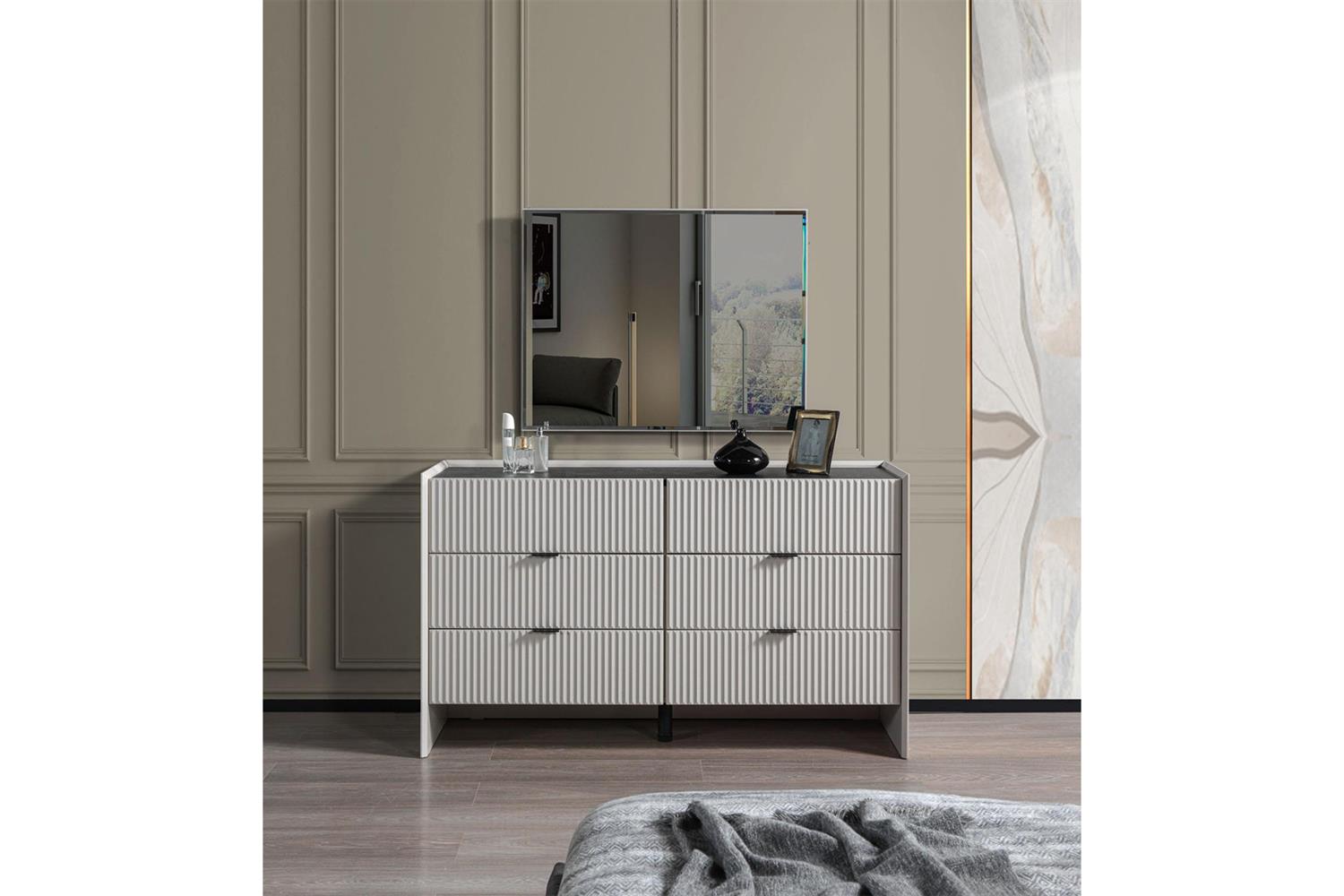 Ürün İçeriği 1 Adet Gardırop, 1 Adet Karyola ve Başlığı, 2 Adet Komodin, 1 Adet Şifonyer ve Aynasından oluşmaktadır.