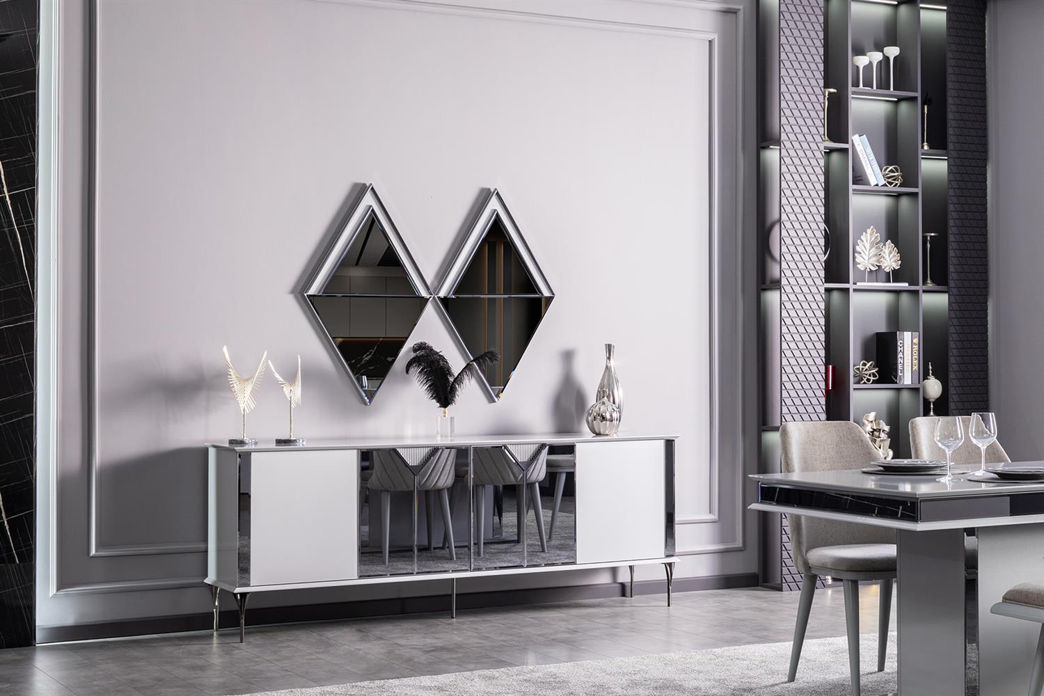 Ürün İçeriği 1 Adet Konsol ve Aynası, 1 Adet Yemek Masası ve 6 Adet Sandalye'den oluşmaktadır.