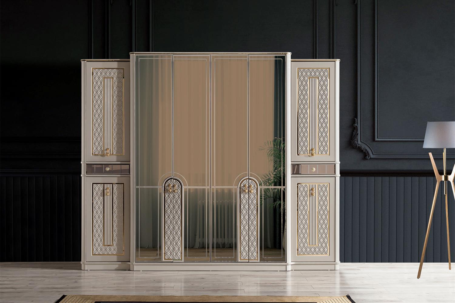 Ürün İçeriği 1 Adet Gardırop, 1 Adet Karyola ve Başlığı, 2 Adet Komodin, 1 Adet Şifonyer ve Aynasından oluşmaktadır.