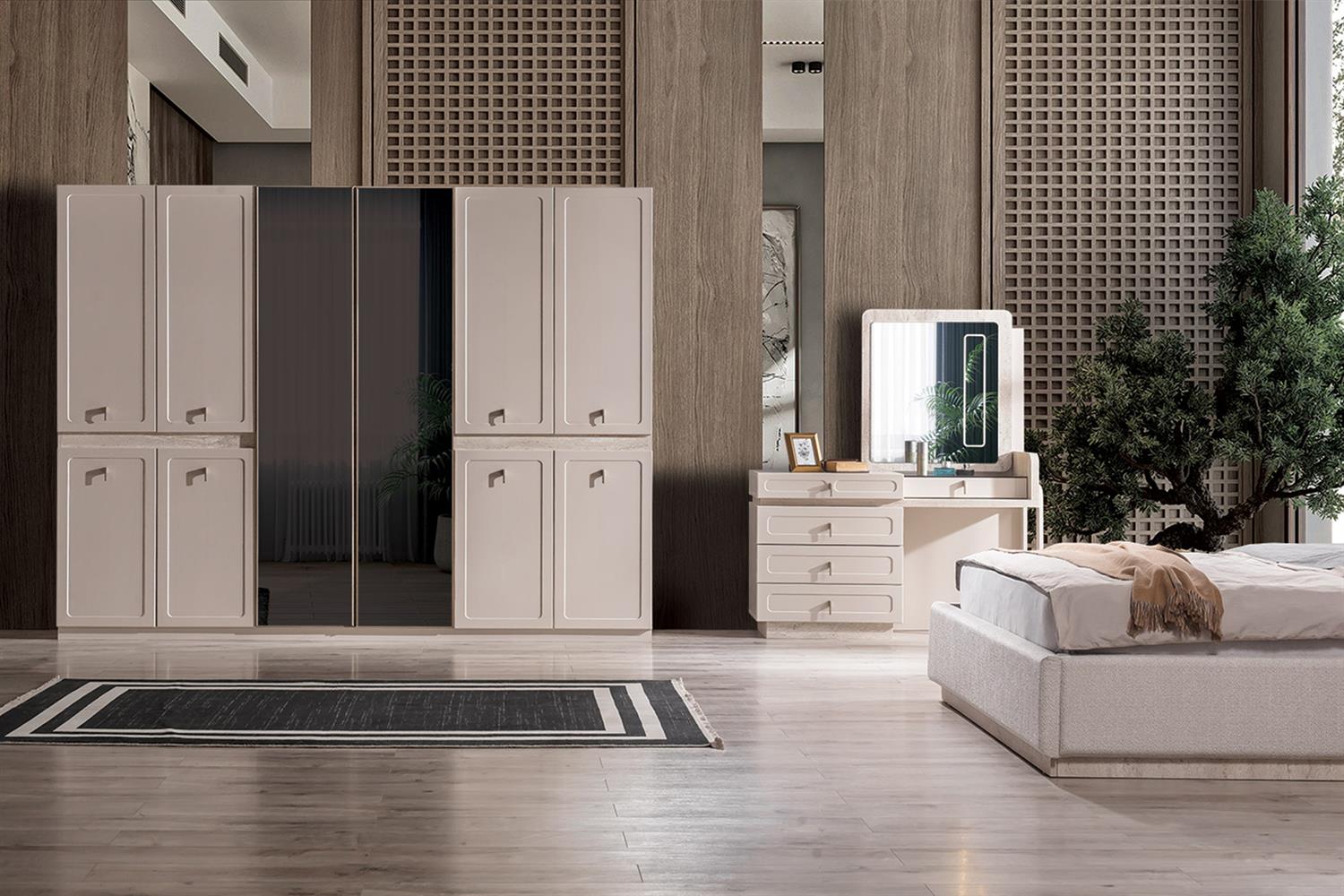 Ürün İçeriği 1 Adet Gardırop, 1 Adet Karyola ve Başlığı, 2 Adet Komodin, 1 Adet Şifonyer ve Aynasından oluşmaktadır.