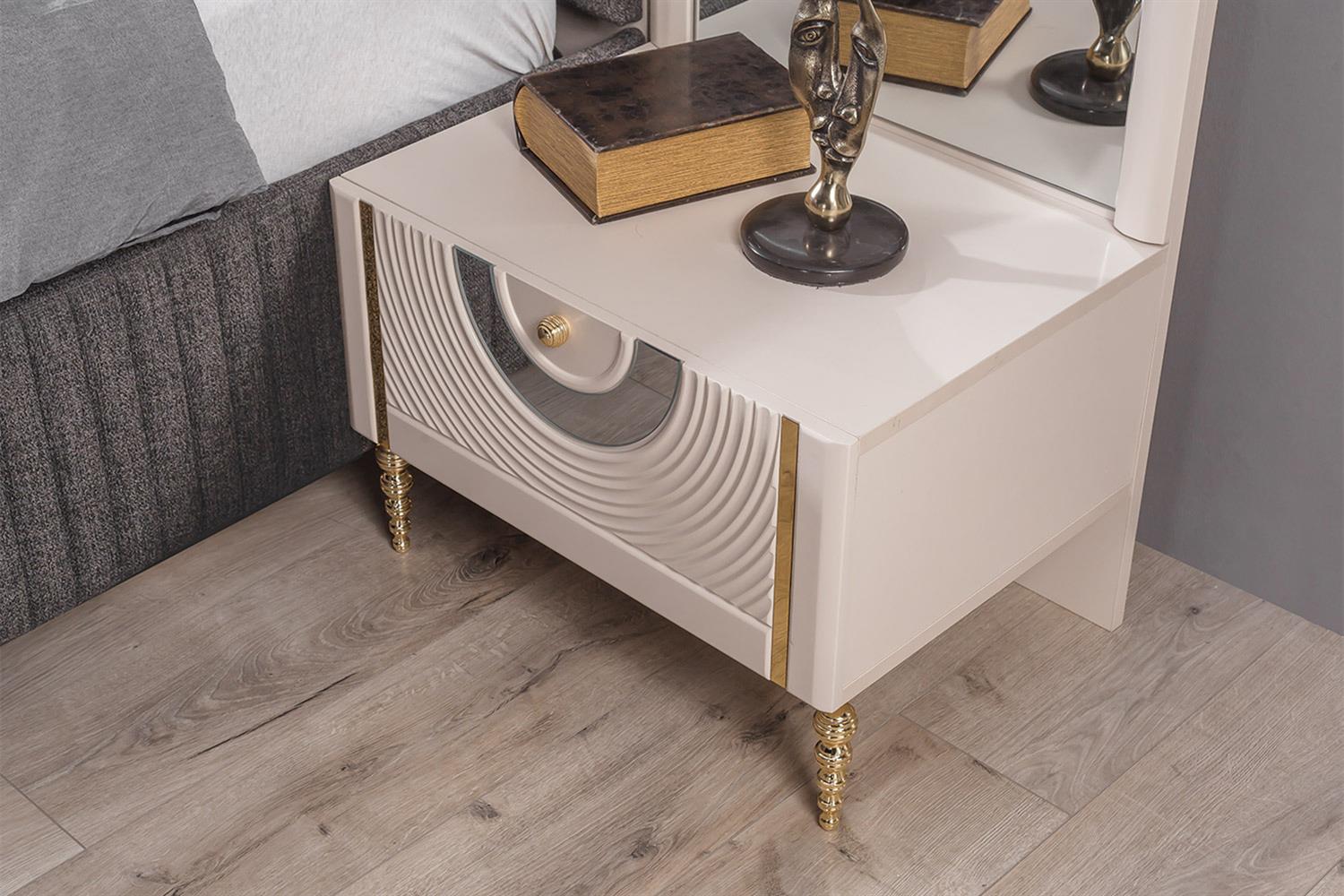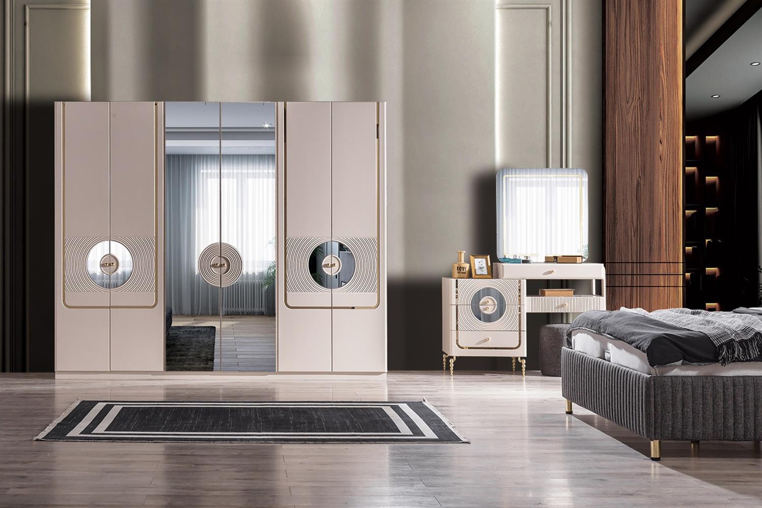 Ürün İçeriği 1 Adet Gardırop, 1 Adet Karyola ve Başlığı, 2 Adet Komodin, 1 Adet Şifonyer ve Aynasından oluşmaktadır.