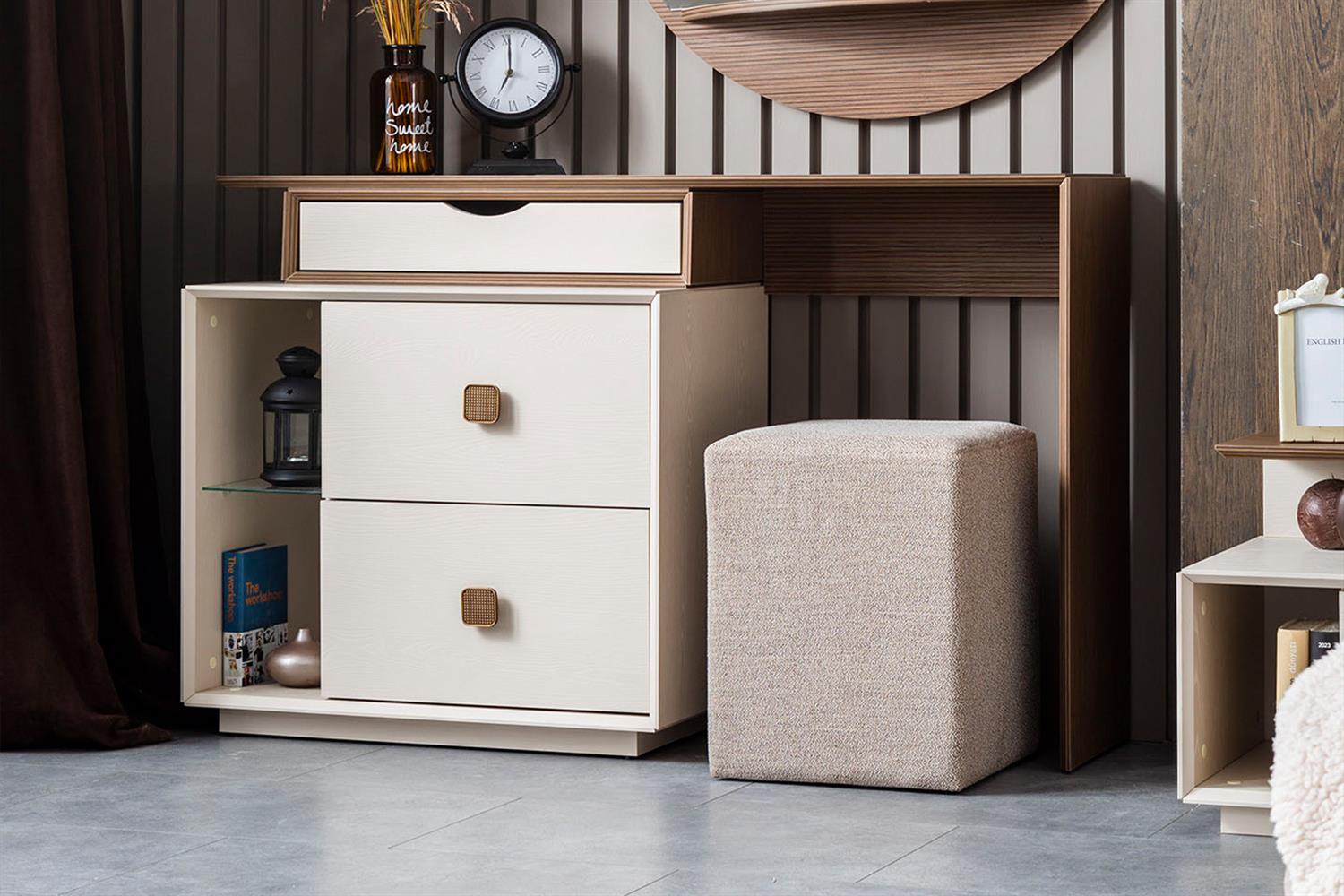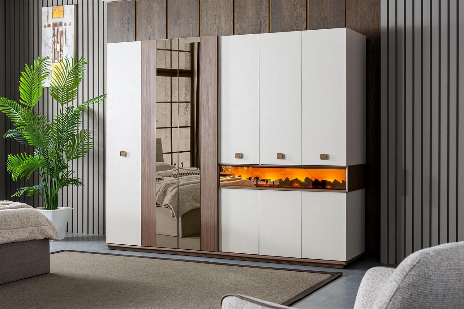 Ürün İçeriği 1 Adet Gardırop, 1 Adet Karyola ve Başlığı, 2 Adet Komodin, 1 Adet Şifonyer ve Aynasından oluşmaktadır.