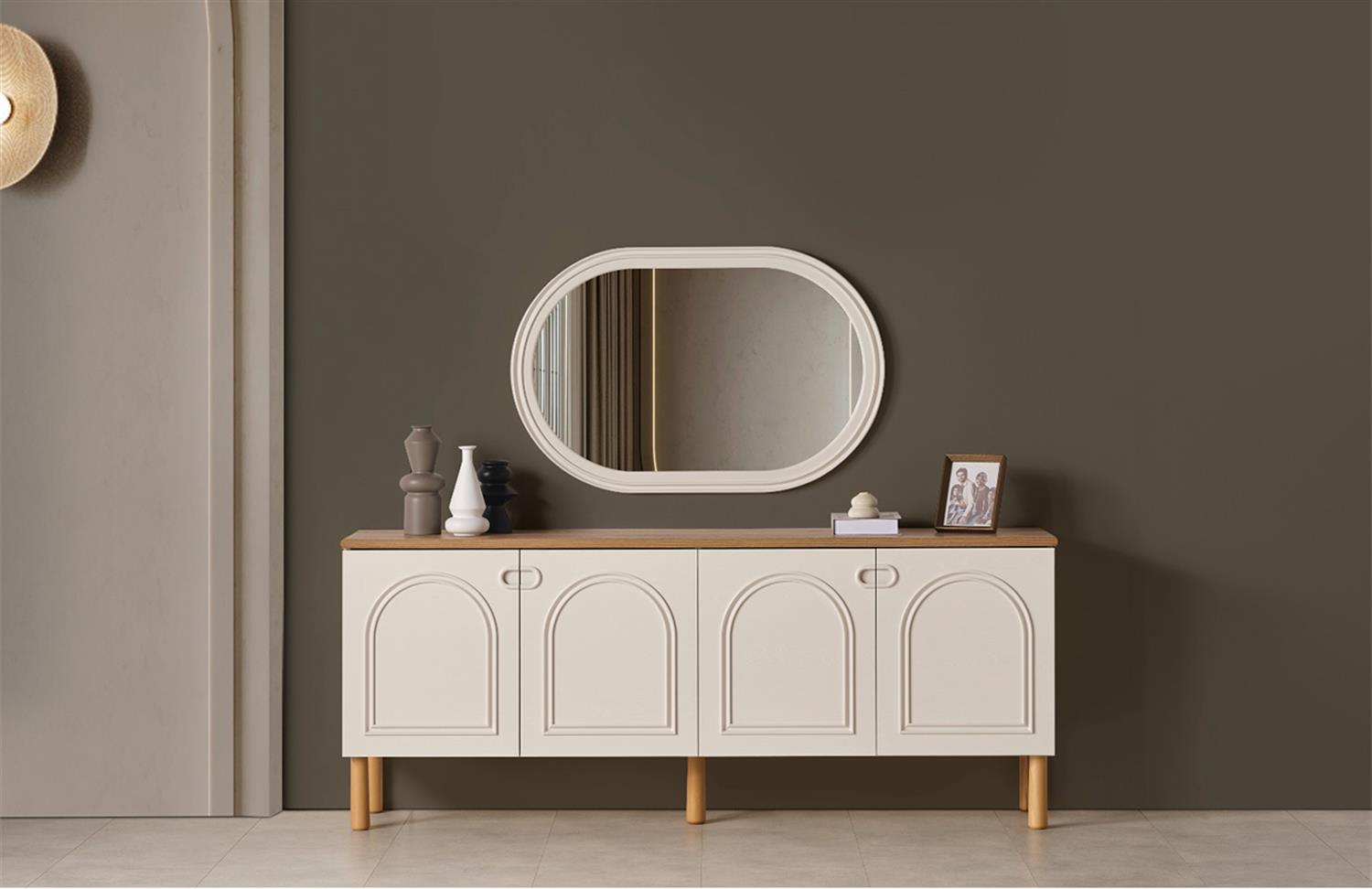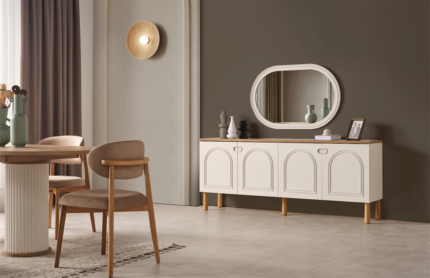 Ürün İçeriği 1 Adet Konsol ve Aynası, 1 Adet Yemek Masası ve 6 Adet Sandalye'den oluşmaktadır.