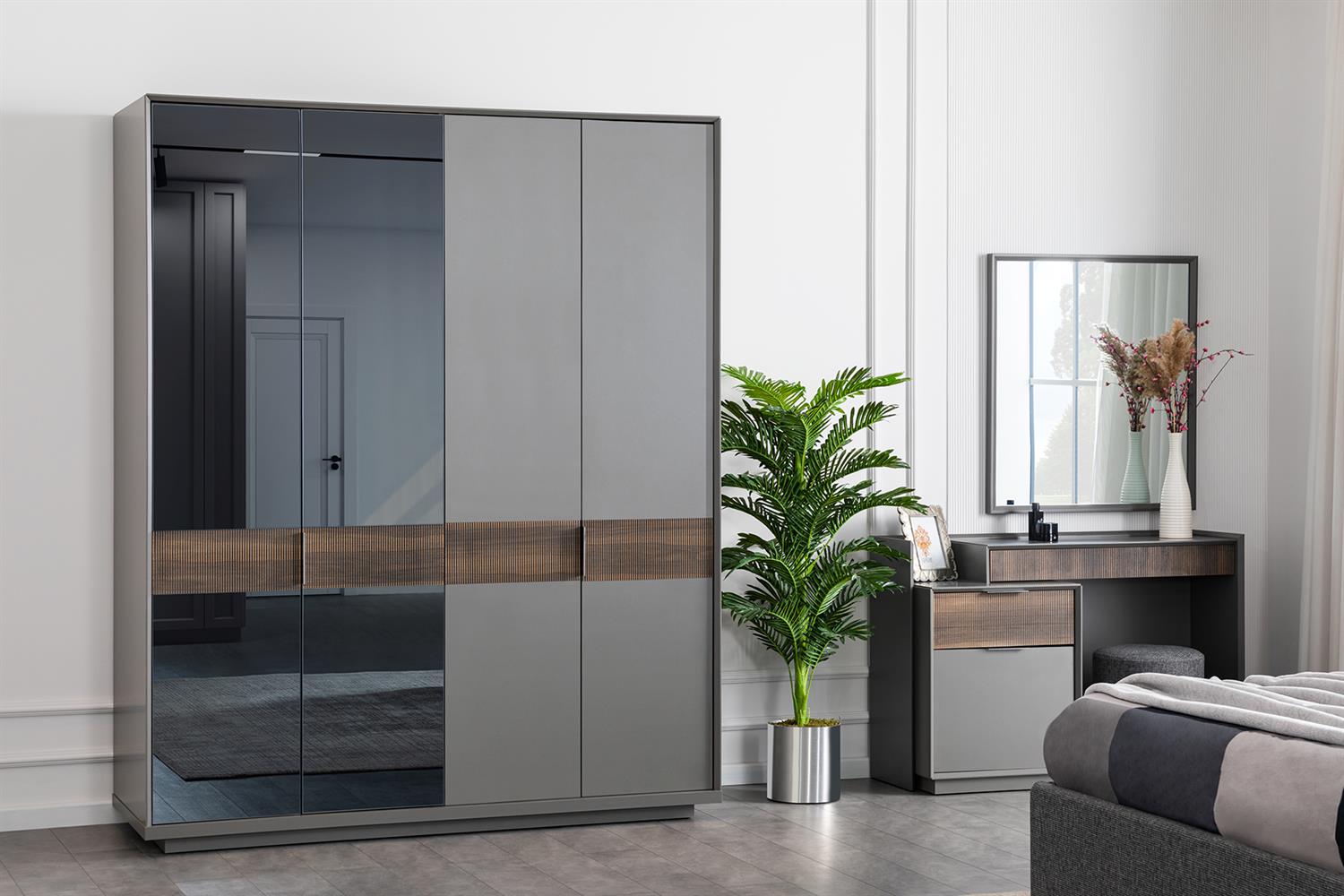 Ürün İçeriği 1 Adet Gardırop, 1 Adet Karyola ve Başlığı, 2 Adet Komodin, 1 Adet Şifonyer ve Aynasından oluşmaktadır.