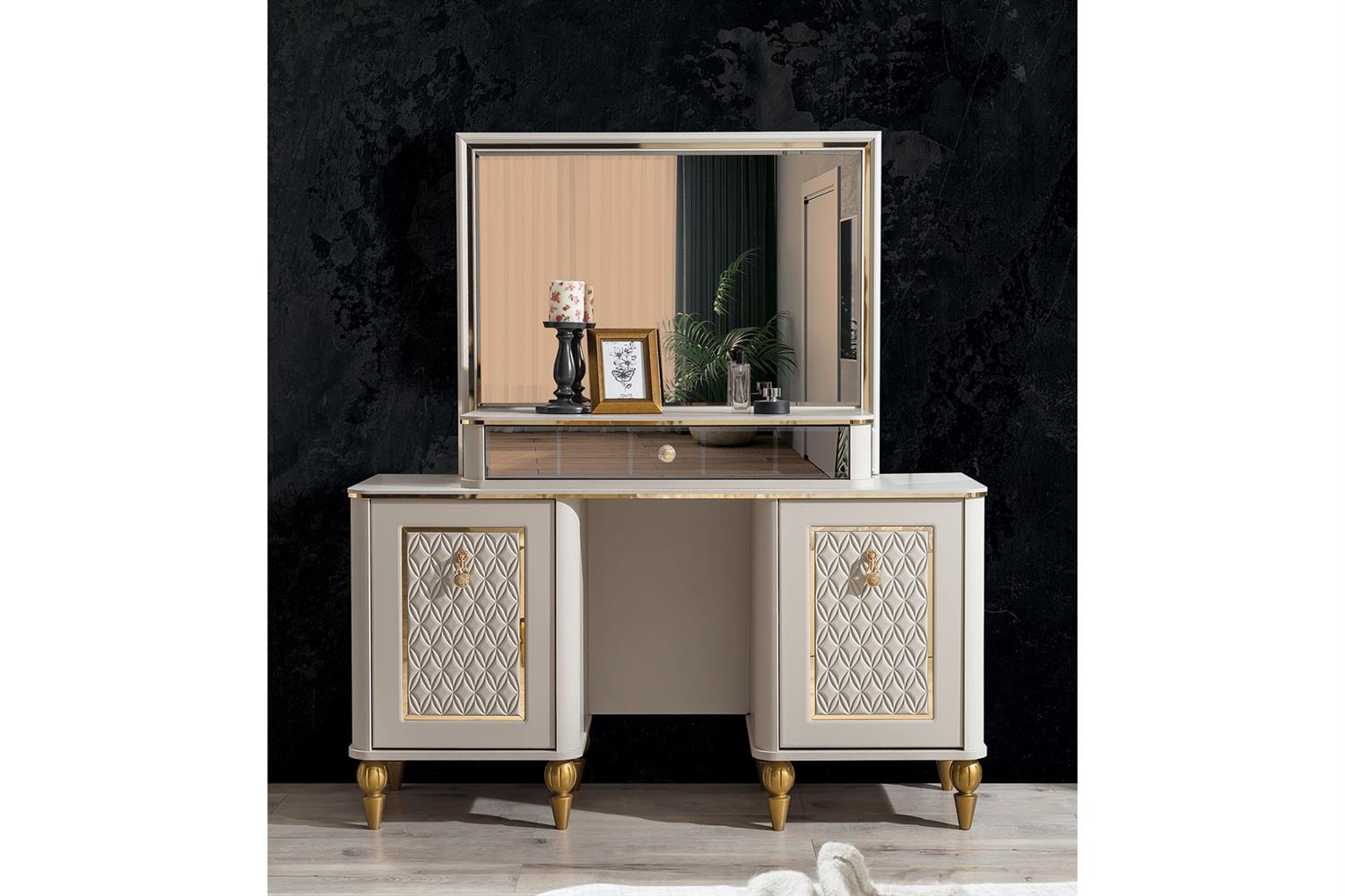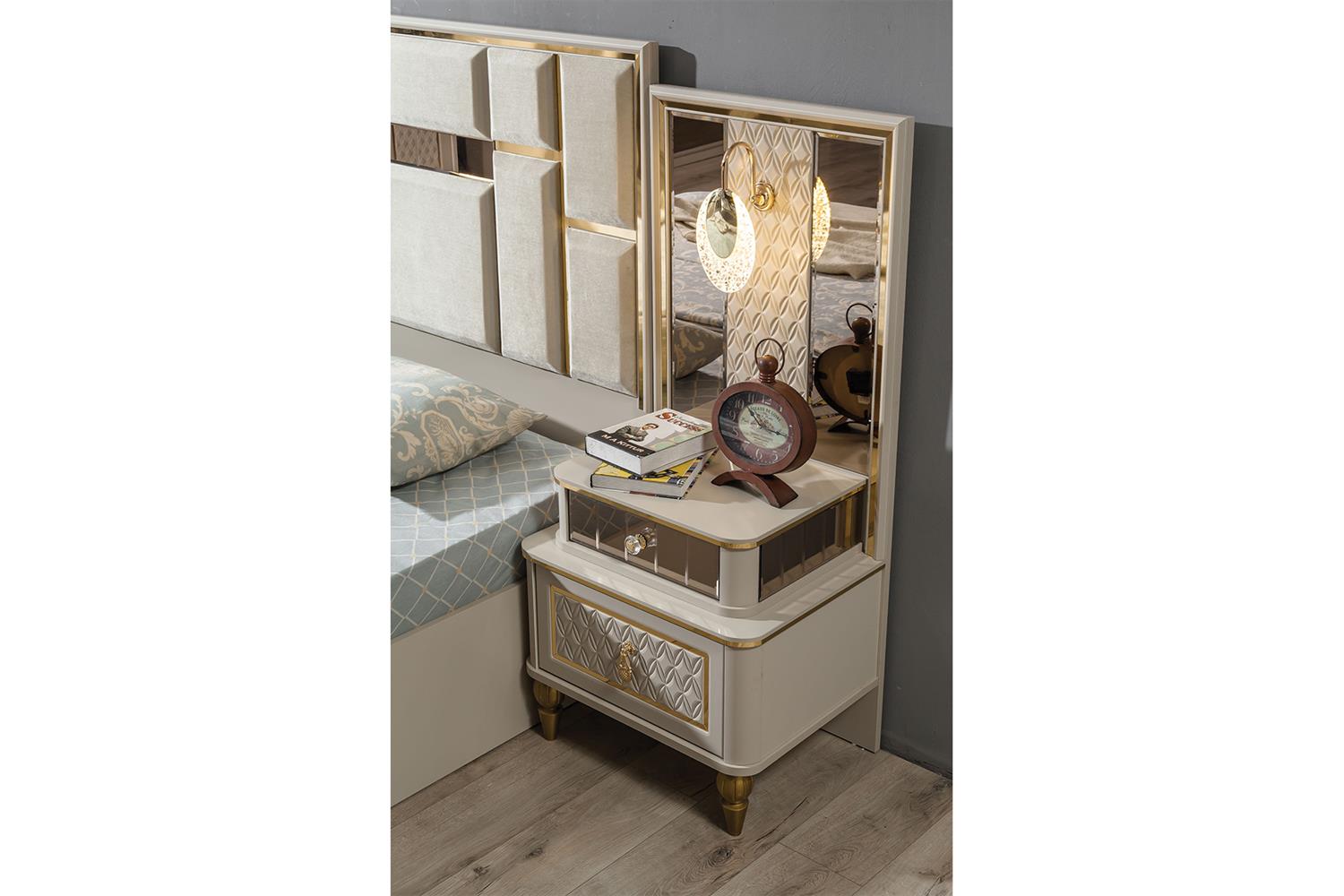 Ürün İçeriği 1 Adet Gardırop, 1 Adet Karyola ve Başlığı, 2 Adet Komodin, 1 Adet Şifonyer ve Aynasından oluşmaktadır.