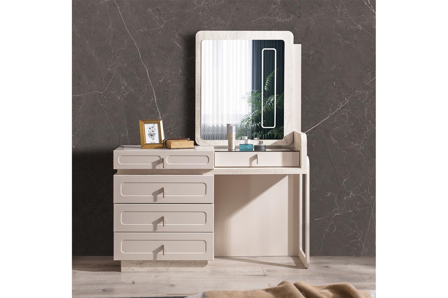 Ürün İçeriği 1 Adet Gardırop, 1 Adet Karyola ve Başlığı, 2 Adet Komodin, 1 Adet Şifonyer ve Aynasından oluşmaktadır.
