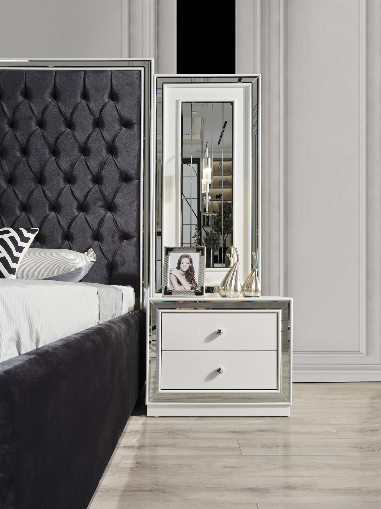 Nightstand Produced with lacquer paint on MDF material. Decorated with CNC patterns. Retarding tandem rails are used in the drawers.