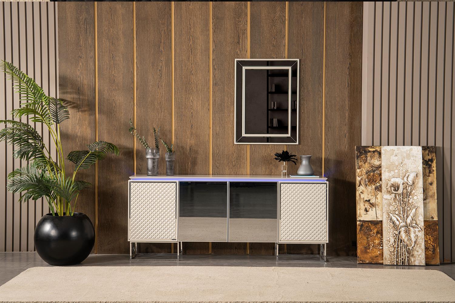 Ürün İçeriği 1 Adet Konsol ve Aynası, 1 Adet Yemek Masası ve 6 Adet Sandalye'den oluşmaktadır.