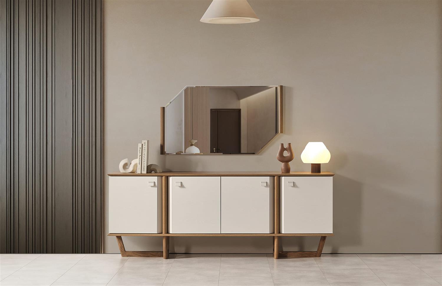 Ürün İçeriği 1 Adet Konsol ve Aynası, 1 Adet Yemek Masası ve 6 Adet Sandalye'den oluşmaktadır.