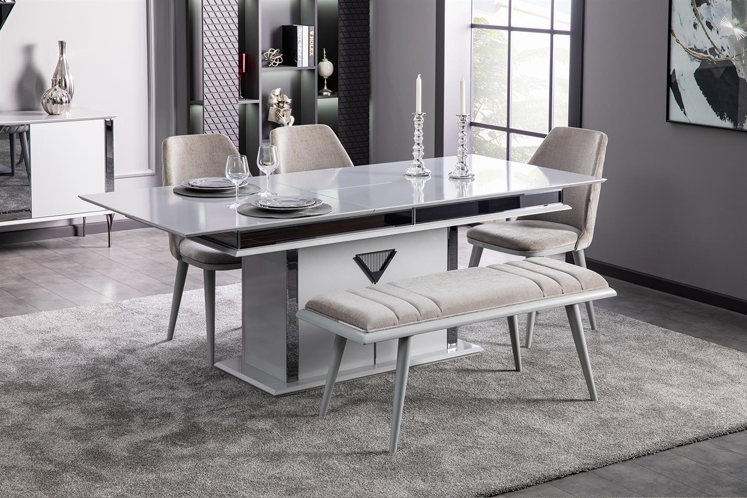 Ürün İçeriği 1 Adet Konsol ve Aynası, 1 Adet Yemek Masası ve 6 Adet Sandalye'den oluşmaktadır.