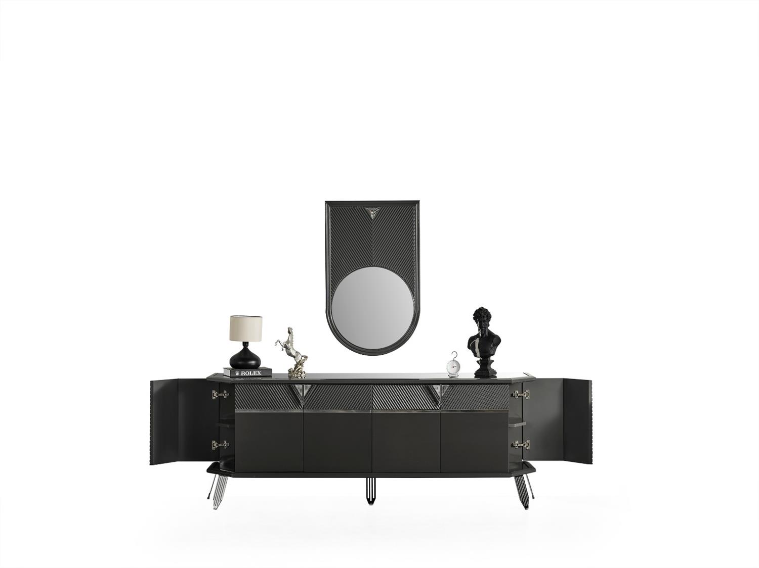 Konsol MDF malzeme üzeri lake boya ile üretilmiştir. CNC desenler ile dekore edilmiştir. Ayaklar metal malzemedir.