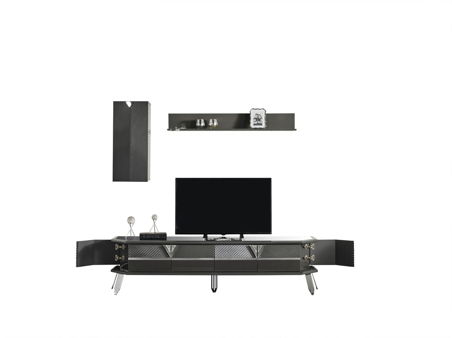 Tv Sehpası MDF malzeme üzeri lake boya ile üretilmiştir. CNC desenler ile dekore edilmiştir. Ayaklar metal malzemedir. Çekmecelerde yavaşlatıcı tandem ray kullanılmıştır.
