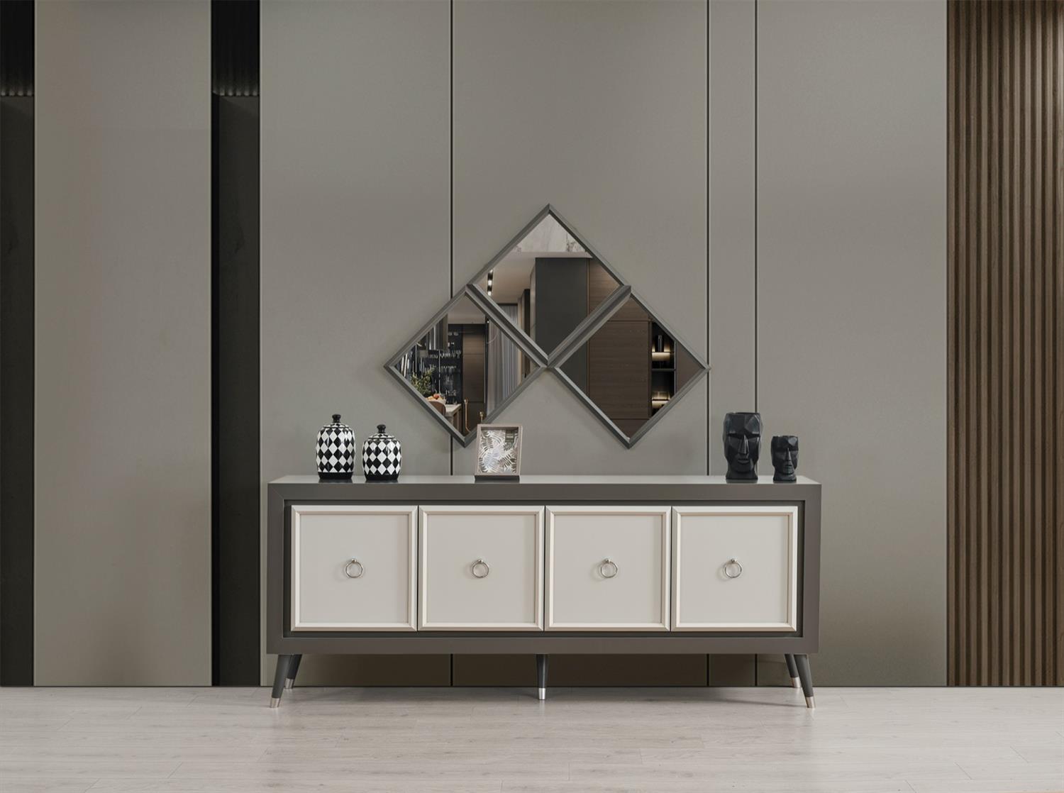 Konsol MDF malzeme üzeri lake boya ile üretilmiştir. CNC desenler ile dekore edilmiştir. Ayaklar metal malzemedir.