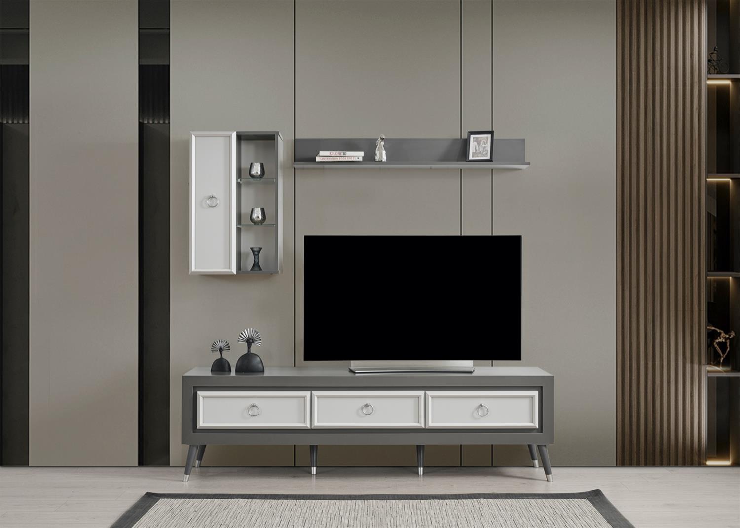 Tv Sehpası MDF malzeme üzeri lake boya ile üretilmiştir. CNC desenler ile dekore edilmiştir. Ayaklar metal malzemedir. Çekmecelerde yavaşlatıcı tandem ray kullanılmıştır.