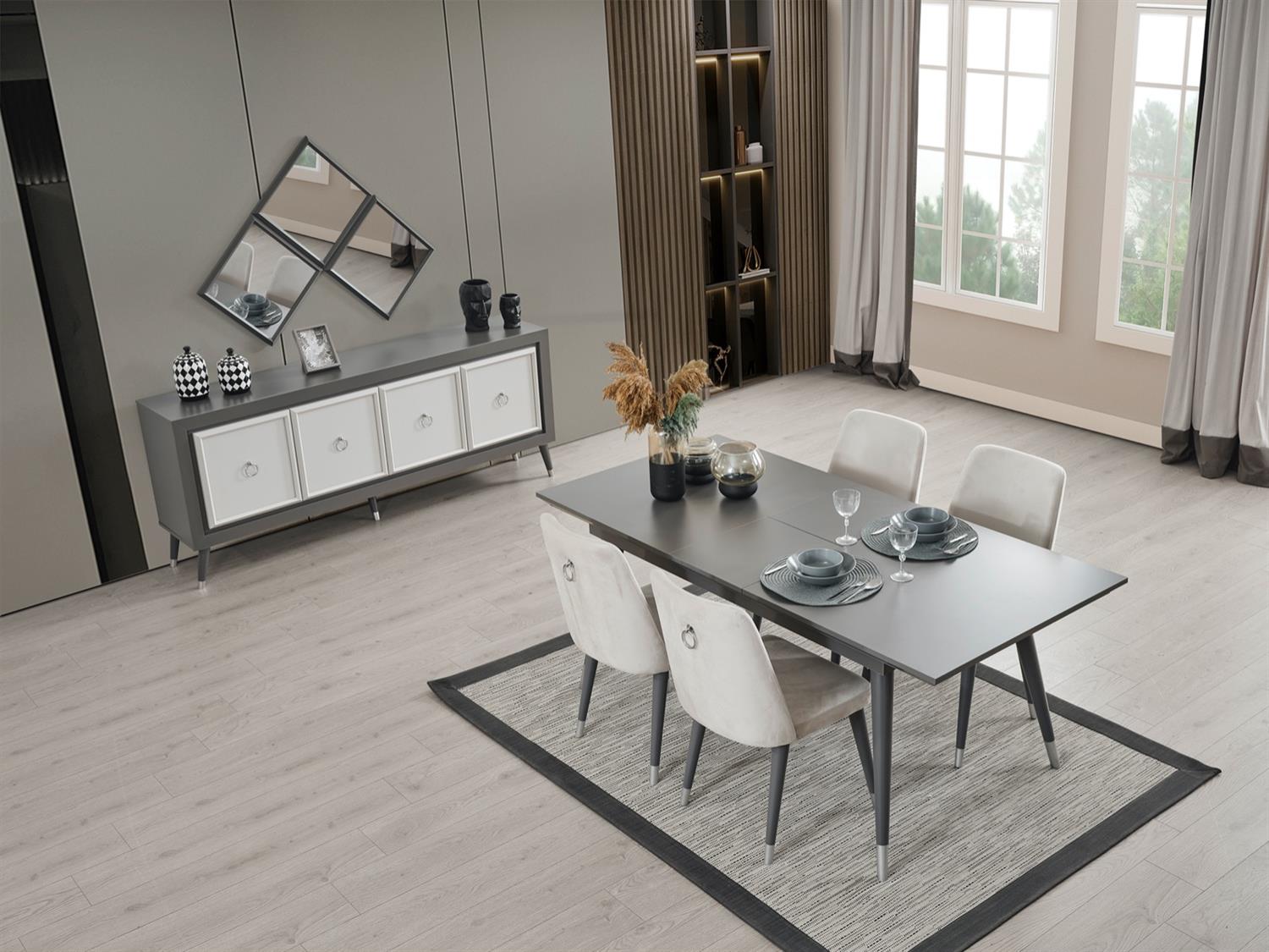 Yemek Masası Üst tabla MDF malzeme üzeri lake boya ile üretilmiştir. Masa tablası ortadan açılabilir özelliğe sahip değildir.