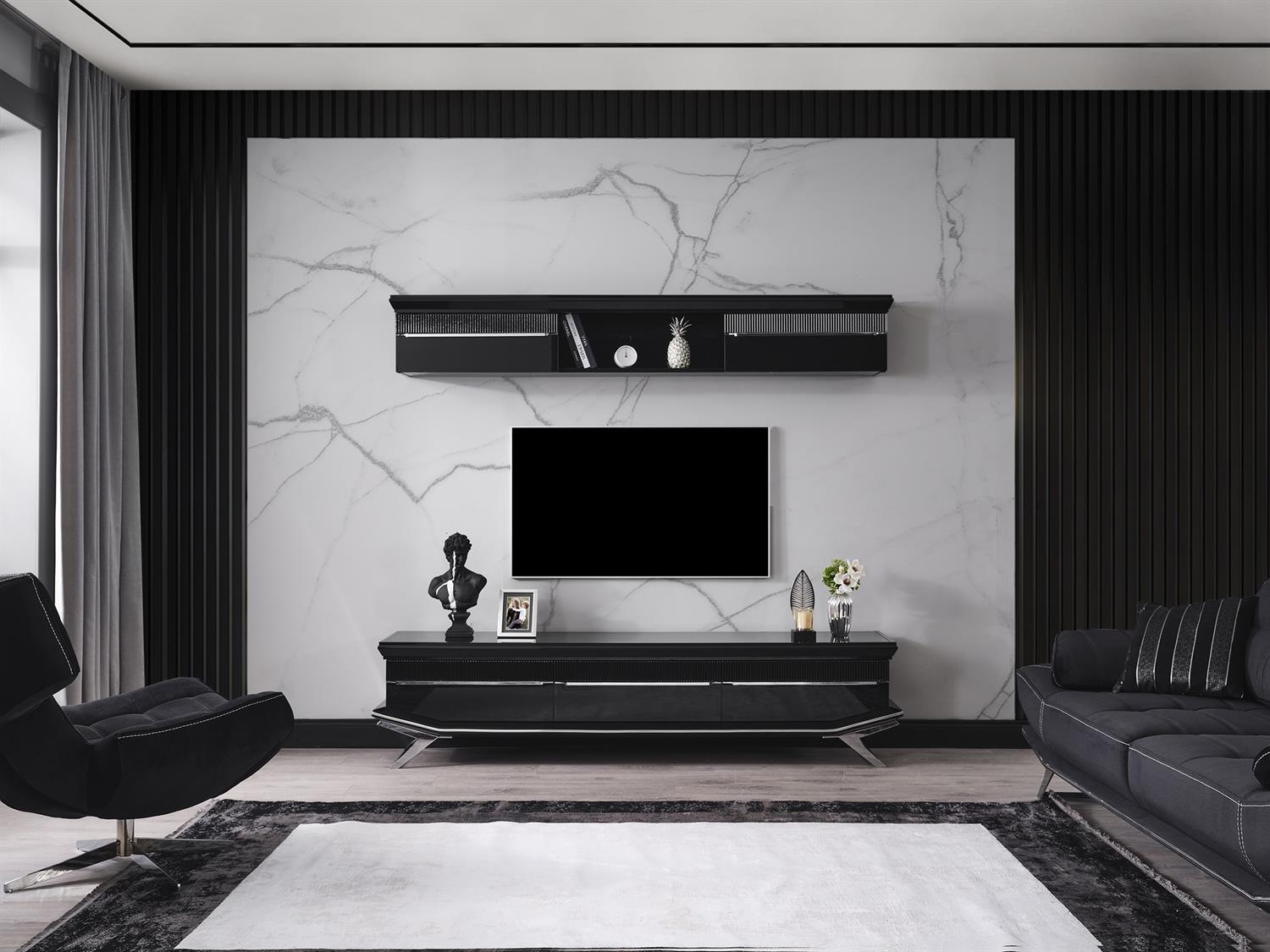 Tv Sehpası MDF malzeme üzeri lake boya ile üretilmiştir. CNC desenler ile dekore edilmiştir. Ayaklar metal malzemedir. Çekmecelerde yavaşlatıcı tandem ray kullanılmıştır.