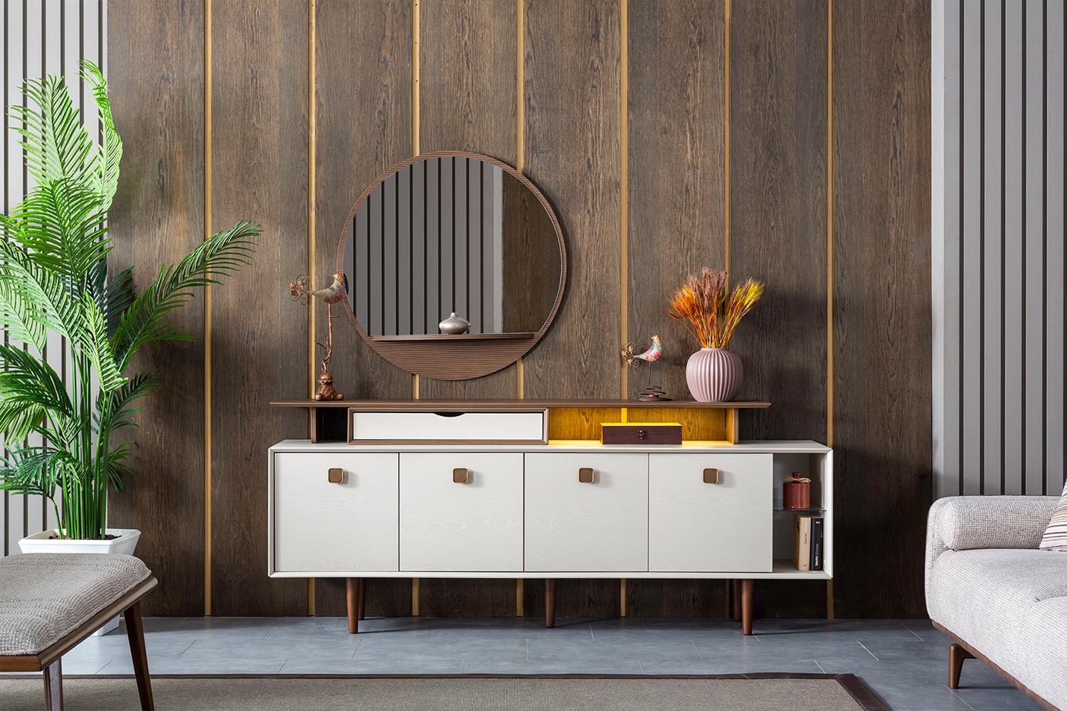 Ürün İçeriği 1 Adet Konsol ve Aynası, 1 Adet Yemek Masası ve 6 Adet Sandalye'den oluşmaktadır.